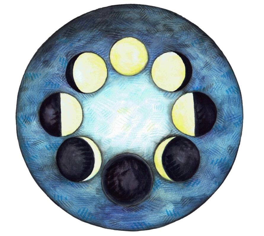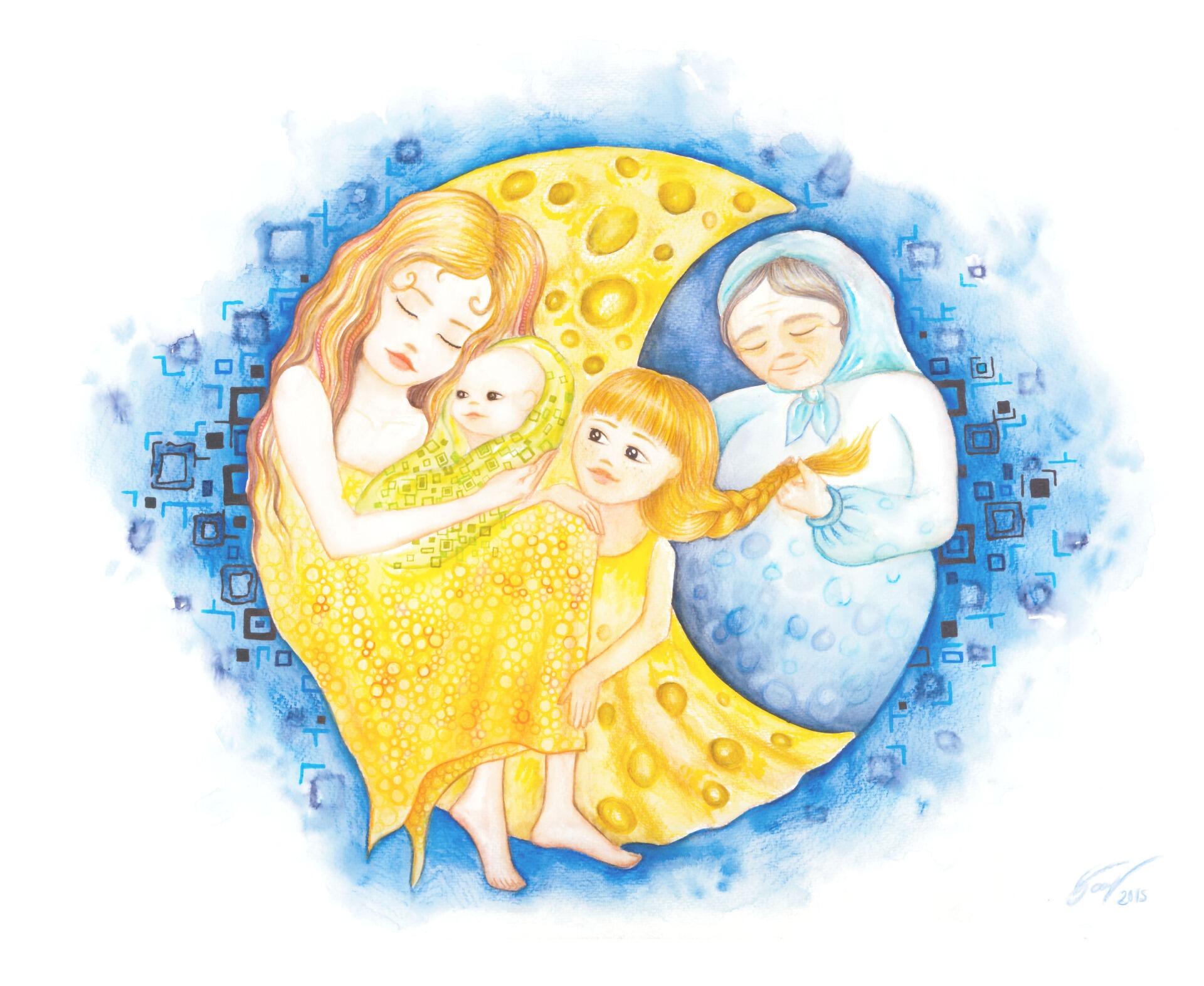 There exists a family of stories in comparative mythology in diverse countries that concern a simpleton who sees a reflection of the Moon and mistakes it for a round cheese (source : Wikipédia)Les trois états de la lune comme trois états de la féminité, décrits par la mère, sont inspirés de la triade lunaire de la mythologie grecque :