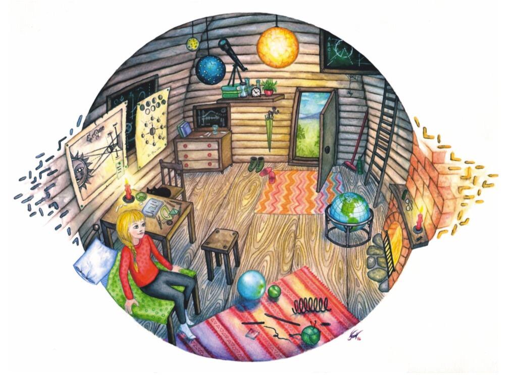 Et le renard argenté, d'un glissement furtif, disparaît dans les rochers. Lou reste seule, exténuée. Elle s'avance jusqu'à la cabane, et s'arrête devant la porte. Il fait encore nuit et tout est silencieux. Comme elle n'ose pas frapper, elle s'allonge devant la cabane, sur la mousse, et s'endort.Quand elle se réveille, elle est allongée dans un lit, au milieu d'une pièce remplie d'objets étranges. Il y a des ardoises recouvertes d'inscriptions à la craie et de dessins, des ficelles et des bâtons de toutes tailles, des miroirs et des morceaux de verre de toutes formes, des cubes, des boules et des objets géométriques de toutes sortes, des ressorts, des sabliers, et beaucoup d'autres objets que Lou ne reconnaît pas.