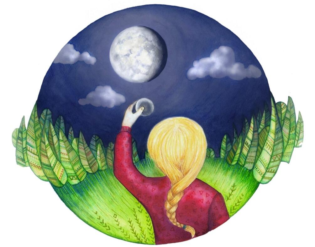 – Bonne nuit, Lune. J'aimerais bien croire que tu m'entends et que tu veilles sur moi, mais je crois que tu es une boule. Et demain, peut-être, je saurai pourquoi il te manque des morceaux.Le lendemain, Lou se lève très tôt, avant le soleil et avant le vieil homme. Elle sort de la cabane avec la petite boule dans la main. Elle observe la boule et réfléchit et observe la boule et réfléchit. Ce qu'il faudrait, pour que la boule ressemble à une petite lune, c'est peindre en noir le morceau manquant... Elle rentre en courant vers la cabane. Le vieil homme est assis devant la porte.