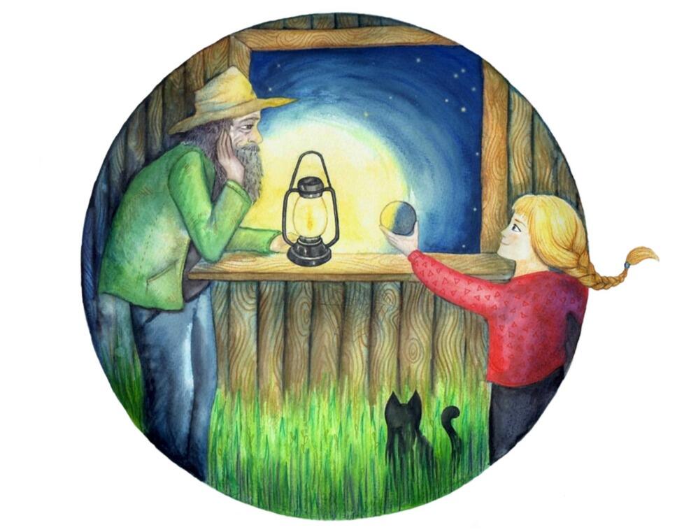 – Je voudrais peindre une partie de la boule en noir.Le vieil homme disparaît dans sa cabane, et revient avec un petit pot de cirage noir. Parce que c'est plus facile, Lou peint la moitié de la boule en noir, comme quand la lune est à moitié pleine. Et alors, miracle ! Quel que soit l'endroit depuis lequel Lou observe la boule, la partie blanche a toujours une forme de lune : parfois pleine, parfois à demi pleine, parfois en croissant. Lou fait tourner lentement la boule sur elle-même et contemple la partie blanche qui prend toutes les formes que prend la lune nuit après nuit.Jusqu'au soir, contente, Lou joue avec sa boule, explore les trésors étranges de la cabane en faisant bien attention à ne rien casser, et rêve à tout ce qu'elle pourrait comprendre en vivant ici. Quand la lune se lève, toute blanche et brillante, elle sort et s'assied devant la cabane, à côté du vieil homme.