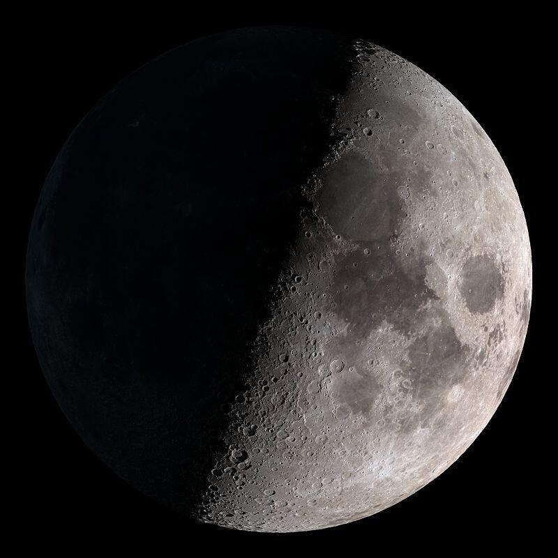 Quelle est la forme exacte d'un croissant de lune ? L'extérieur du croissant est une partie du contour apparent de la lune ; c'est un demi-cercle. La partie intérieure est la courbe qui délimite l'ombre et la lumière, on l'appelle le terminateur. Comme le soleil éclaire toujours exactement la moitié de la lune, le terminateur est toujours un cercle, (c'est quoi, un cercle sur une sphère ? Ben, par exemple, l'équateur est un cercle sur la terre), mais qu'on voit généralement en perspective. Donc l'intérieur du croissant est une demi-ellipse plus ou moins allongée. Quand elle est allongée à l'extrême, elle est complètement aplatie et c'est demi-lune. Quand elle n'est pas du tout allongée, elle est complètement ronde et c'est pleine lune ou nouvelle lune.Une question pour finir (qui peut être l'occasion d'une belle et grande promenade) :